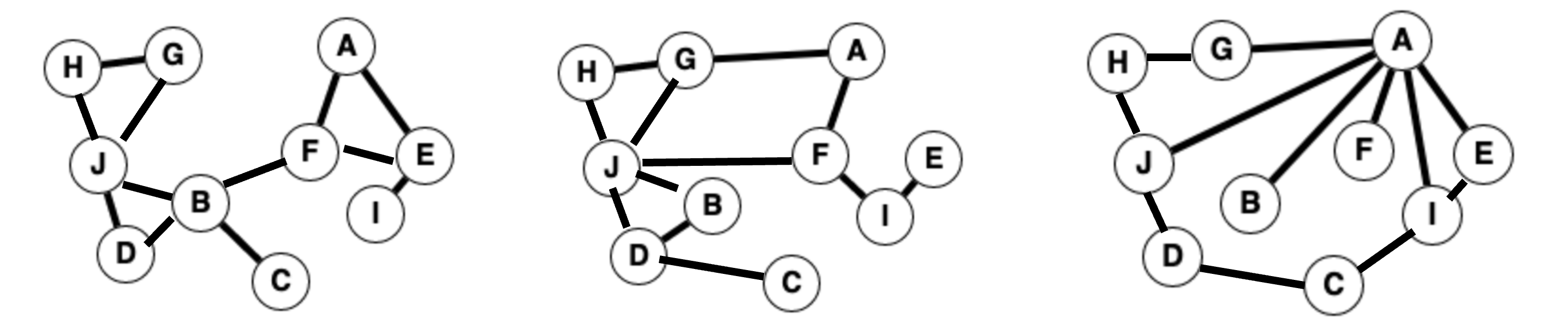 In this example we are going to explore the density of randomly generated graphs (aka networks). This was a problem on the Stanford Midterm Fall 2022. As an example to get us started, here are three different networks each with 10 nodes and 12 random edges: