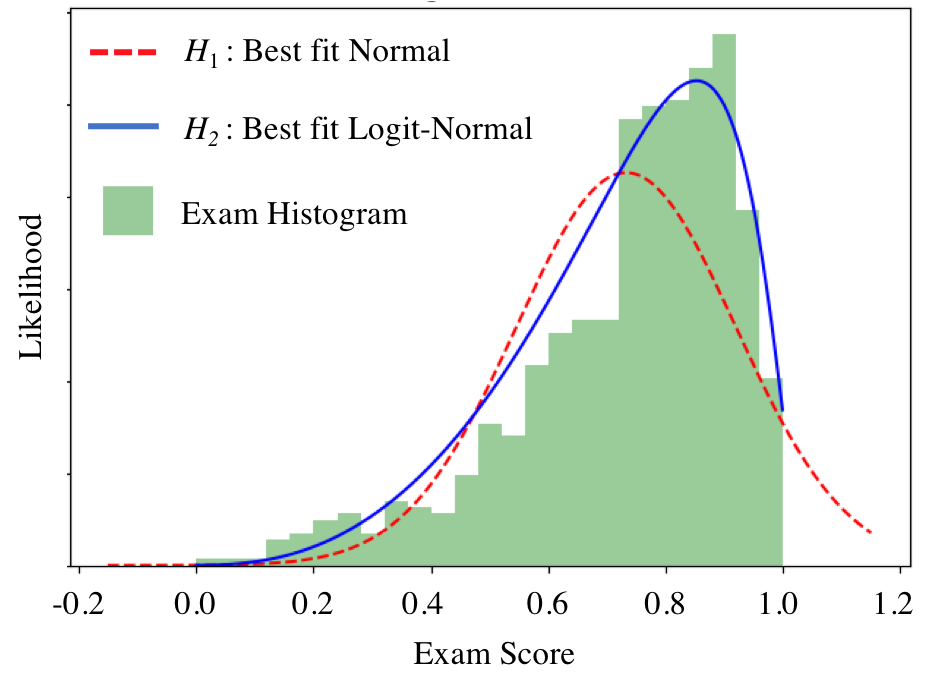 A new theory shows that the Logit Normal better fits exam score distributions than the traditionally used Normal. Let's test it out! We have some set of exam scores for a test with min possible score 0 and max possible score 1, and we are trying to decide between two hypotheses:
