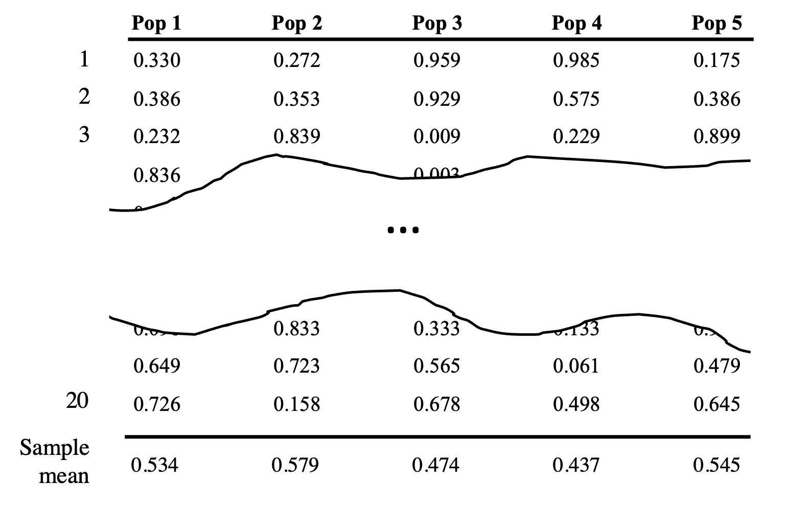 The numbers in the table above are just for demonstration purposes. You should not base your answer off of them. We call each population a random population to emphasize that there is no pattern.