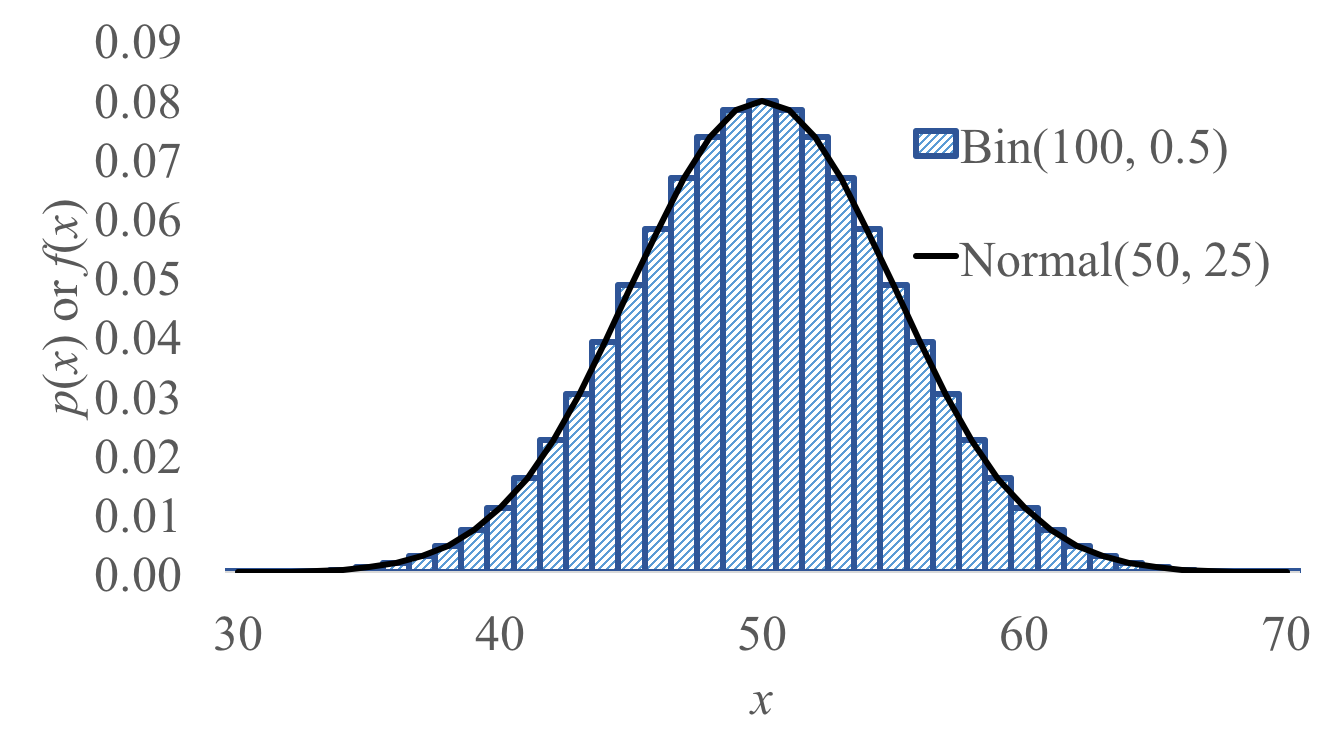 For a Binomial where $n$ is large and $p$ is mid-ranged, a Normal can be used to approximate the Binomial. Let's take a side by side view of a normal and a binomial: