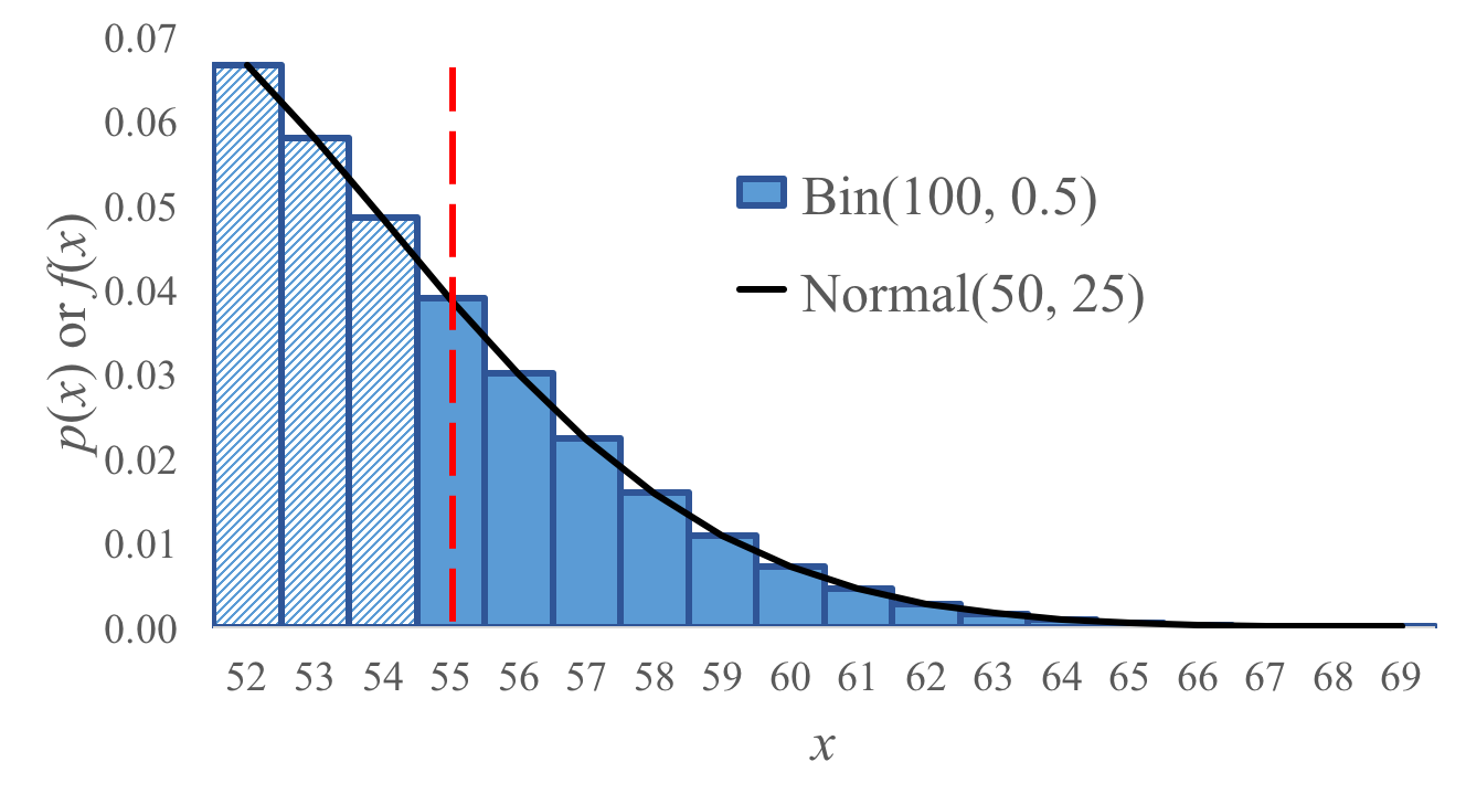 Example: 100 visitors to your website are given a new design. Let $X$ = # of people who were given the new design and spend more time on your website. Your CEO will endorse the new design if $X \geq 65$. What is $P(\text{CEO endorses change}|\text{it has no effect})$?