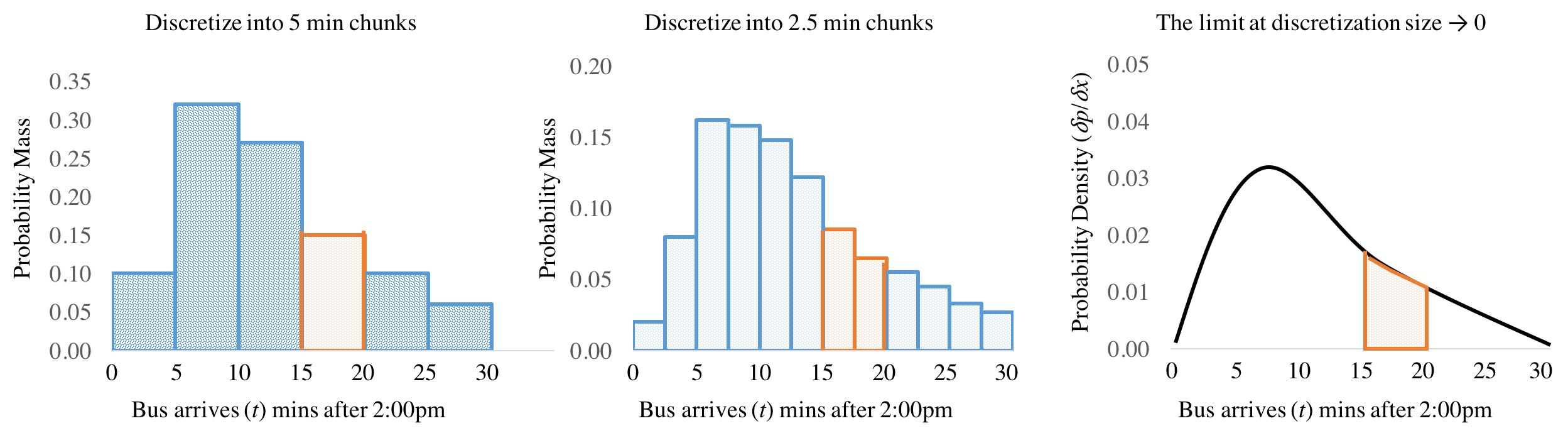 Instead, let's start by discretizing time, our continuous variable, by breaking it into 5 minute chunks. We can now think about something like, the probability that the bus arrives between 2:00p and 2:05 as an event with some probability (see figure below on the left). Five minute chunks seem a bit coarse. You could imagine that instead, we could have discretized time into 2.5 minute chunks (figure in the center). In this case the probability that the bus shows up between 15 mins and 20 mins after 2pm is the sum of two chunks, shown in orange. Why stop there? In the limit we could keep breaking time down into smaller and smaller pieces. Eventually we will be left with a derivative of probability at each moment of time, where the probability that $P(15 < T < 20)$ is the integral of that derivative between 15 and 20 (figure on the right).
