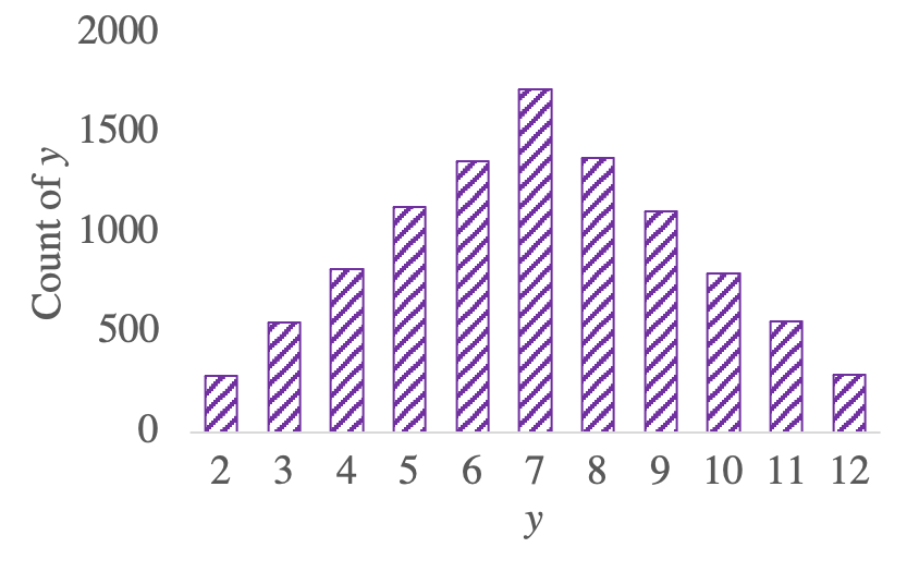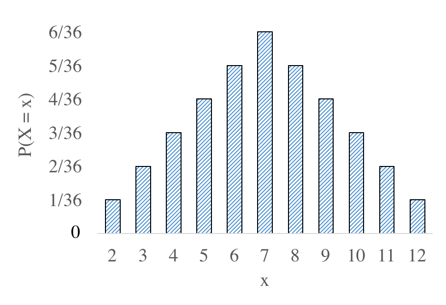 The sum of two dice example in the equally likely probability section. Again, the information that is provided in these graphs is the likelihood of a random variable taking on different values. In the graph on the right, the value "$6$" on the $x$-axis is associated with the probability $\frac{5}{36}$ on the $y$-axis. This $x$-axis refers to the event "the sum of two dice is 6" or $Y=6$. The $y$-axis tells us that the probability of that event is $\frac{5}{36}$. In full: $\p(Y=6) = \frac{5}{36}$. The value "$2$" is associated with "$\frac{1}{36}$" which tells us that, $\p(Y=2) = \frac{1}{36}$, the probability that two dice sum to 2 is $\frac{1}{36}$. There is no value associated with "$1$" because the sum of two dice can not be 1. If you find this notation confusing, revisit the random variables section.