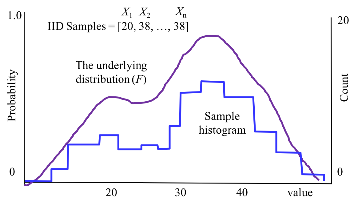 We assume that the data we look at are IID from the same underlying distribution ($F$) with a true mean ($\mu$) and a true variance ($\sigma^2$). Since we can't talk to everyone in Bhutan we have to rely on our sample to estimate the mean and variance. From our sample we can calculate a sample mean ($\bar{X}$) and a sample variance ($S^2$). These are the best guesses that we can make about the true mean and true variance. \begin{align*} \bar{X} &= \sum_{i=1}^n \frac{X_i}{n} \\ S^2 &= \frac{1}{n-1}\sum_{i=1}^n (X_i - \bar{X})^2 \end{align*} The first question to ask is, are those unbiased estimates? Yes. Unbiased, means that if we were to repeat this sampling process many times, the expected value of our estimates should be equal to the true values we are trying to estimate. We will prove that that is the case for $\bar{X}$. The proof for $S^2$ is in lecture slides. \begin{align*} E[\bar{X}] &= E[\sum_{i=1}^n \frac{X_i}{n}] = \frac{1}{n}E\left[\sum_{i=1}^n X_i\right] \\ &= \frac{1}{n}\sum_{i=1}^n E[X_i] = \frac{1}{n}\sum_{i=1}^n \mu = \frac{1}{n}n\mu = \mu \end{align*}